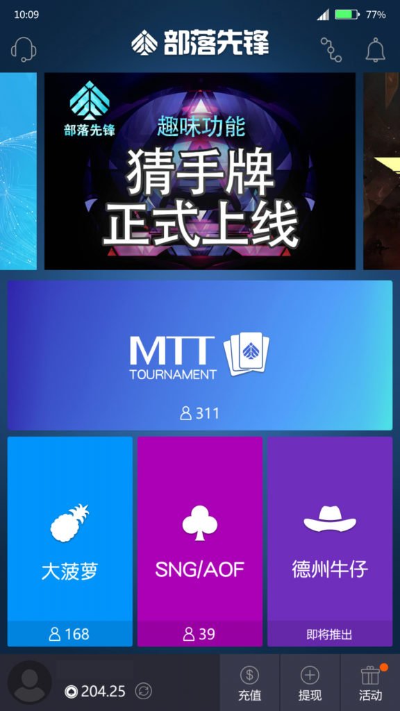 部落先锋提供大菠萝,SNG、AOF和MTT比赛,点击左下角头像可以看到你的名字,战绩,牌谱收藏,背包和设置。
